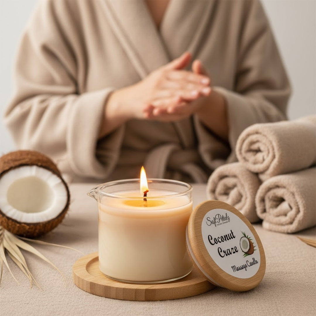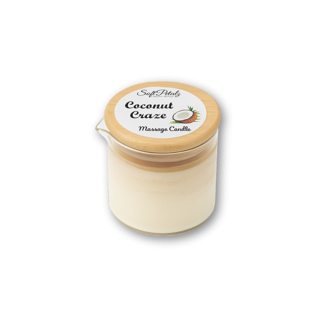 Coconut Craze Massage Candle Experience tropical relaxation with our Coconut Craze massage candle, formulated with coconut and beeswax as a sustainable base. This expertly blended candle transforms into a luxurious massage oil infused with shea butter, mango butter, and cocoa butter for intensive skin nourishment. A curated selection of carrier oils—olive, grapeseed, avocado, argan, and rosehip—delivers antioxidants and essential fatty acids to support skin health. Enhanced with coconut-inspired essential oils and shimmering mica, this candle merges aromatherapy benefits with professional-grade skincare in one indulgent product.