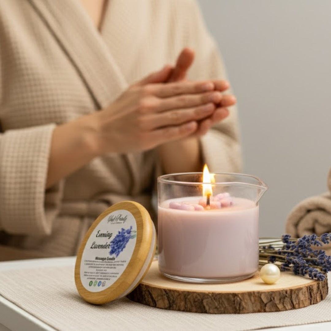 Indulge in the therapeutic benefits of our Lavender Massage Candle, expertly crafted to melt into luxurious massage oil. As the flame dances, premium lavender essential oil releases its calming aromatherapy properties, while the warm wax transforms into silky, nourishing oil perfect for soothing tired muscles. This dual-purpose candle combines ambiance with skincare, delivering spa-quality relaxation in one elegant vessel. Ideal for unwinding after a long day or enhancing your self-care ritual with natural, aromatic indulgence.