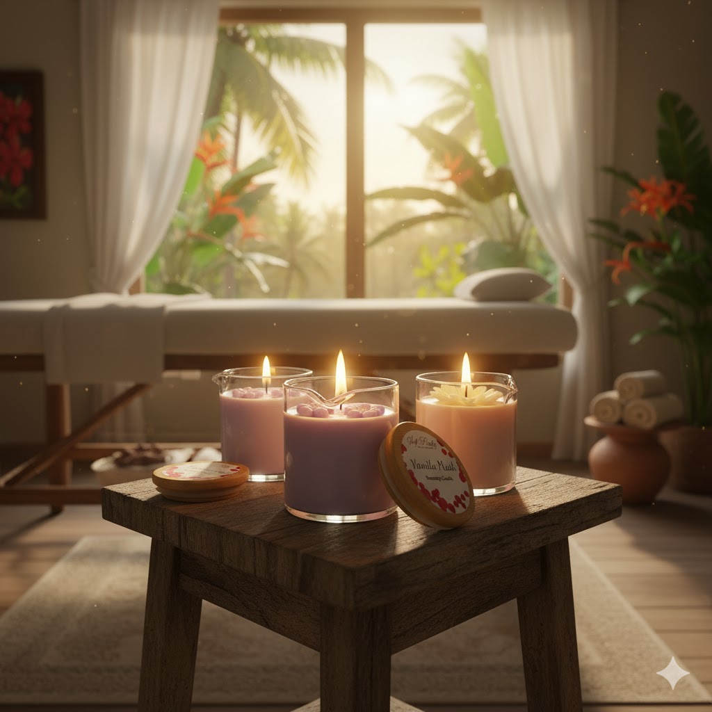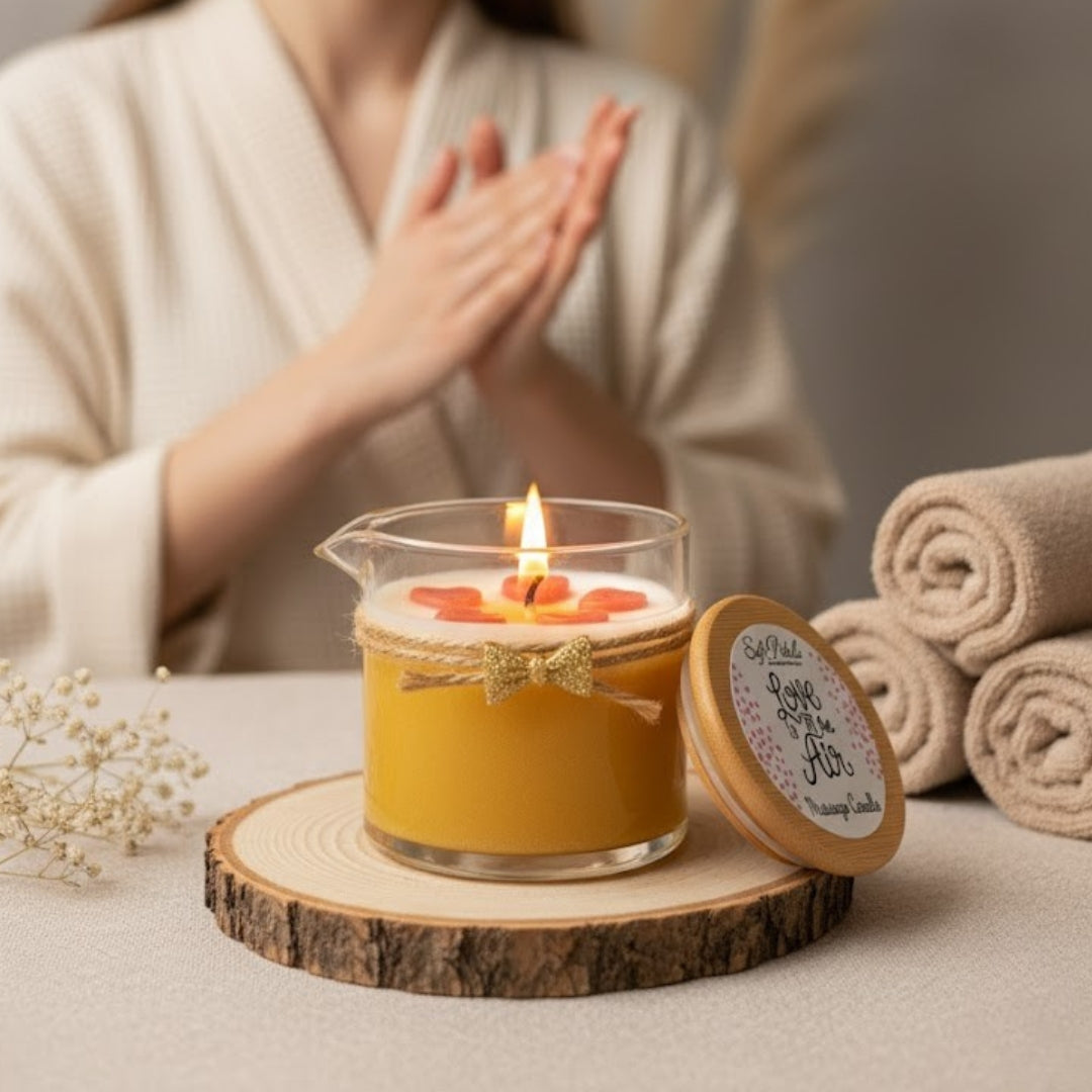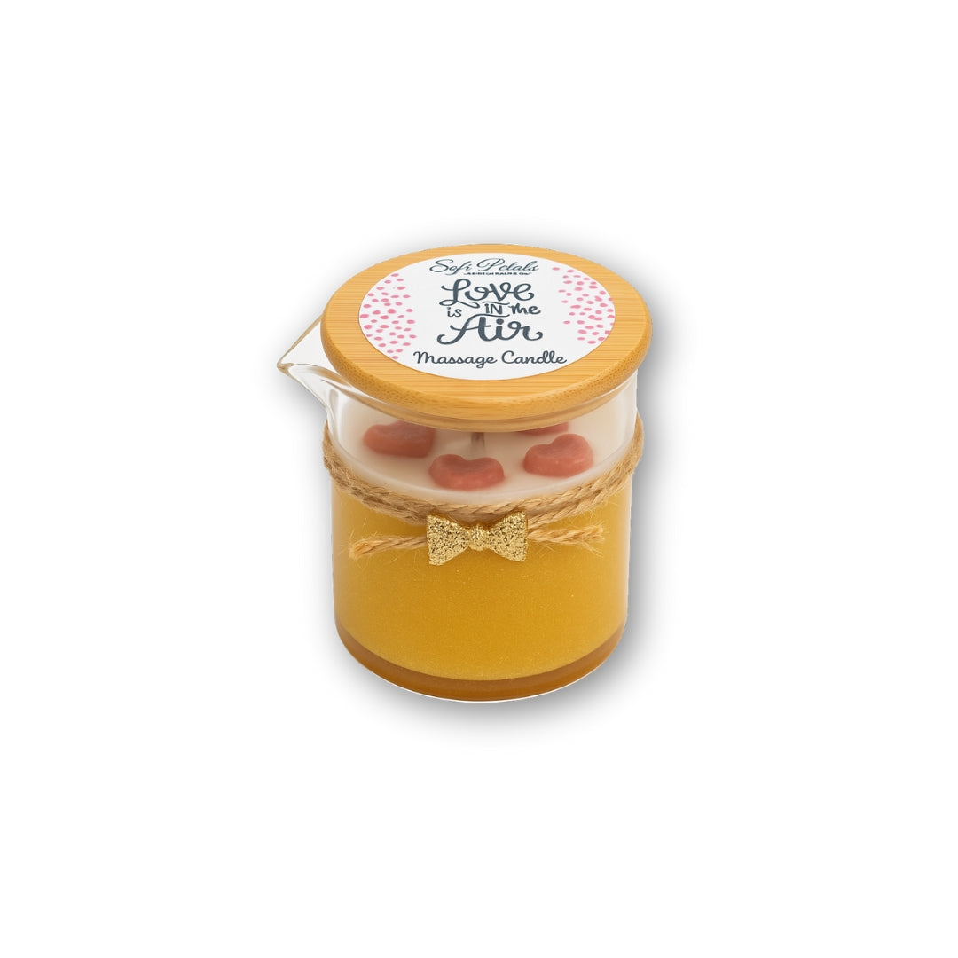 Love In Air is a premium massage candle formulated with a sophisticated blend of natural waxes and botanical oils. The coconut and beeswax base creates a clean-burning candle that melts into a silky massage oil enriched with shea butter, mango butter, and cocoa butter for deep hydration. A curated selection of nourishing oils—olive, grapeseed, avocado, argan, and rosehip—work synergistically to condition skin while essential oils provide aromatic benefits. Enhanced with natural mica for a luminous finish, this multi-purpose candle delivers spa-quality massage and skincare in one elegant product, suitable for face and body use.
